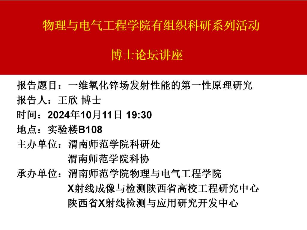 10月11日,9728太阳集团科研系列活动博士论坛讲座由王欣博士做学术交流。报告交流题目为:一维氧化锌纳米结构场发射第一性原理研究。报告会由9728太阳集团副院长何冰主持,薛晶、王志全、薛攀攀、董陈岗、李盼、王之墨、杨瑞平、赵晓云等多名博士参加了本次交流会。