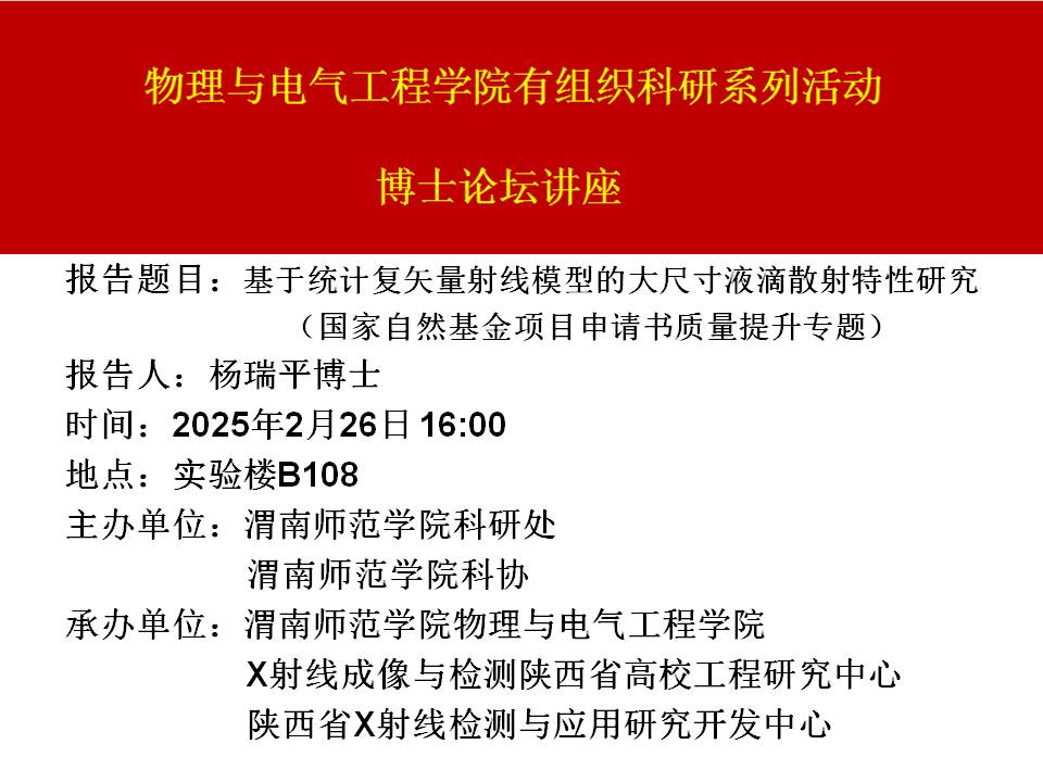 2月26日,9728太阳集团科研系列活动博士论坛讲座由杨瑞平博士做学术交流。报告交流题目为:基于统计复矢量射线模型的大尺寸液滴散射特性研究。报告会由9728太阳集团副院长何冰主持,唐浩、邓莉君、王志全、王欣、李盼、席文强、王之墨、张甜、杨脱颖、曹佳萌等多名博士参加了本次交流会。