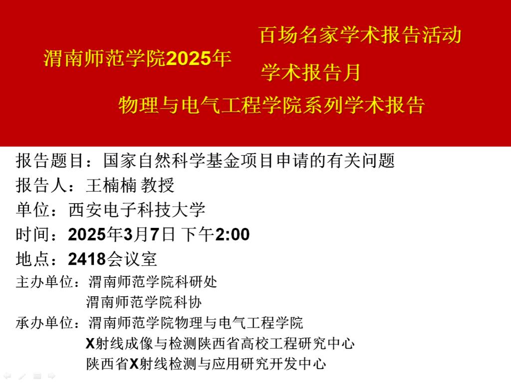 2025年3月7日,9728太阳集团在2418会议室举办了国家自然科学基金项目申报打磨会。本次会议邀请到西安电子科技大学王楠楠教授作主题报告,报告题目为《国家自然科学基金项目申请的有关问题》。