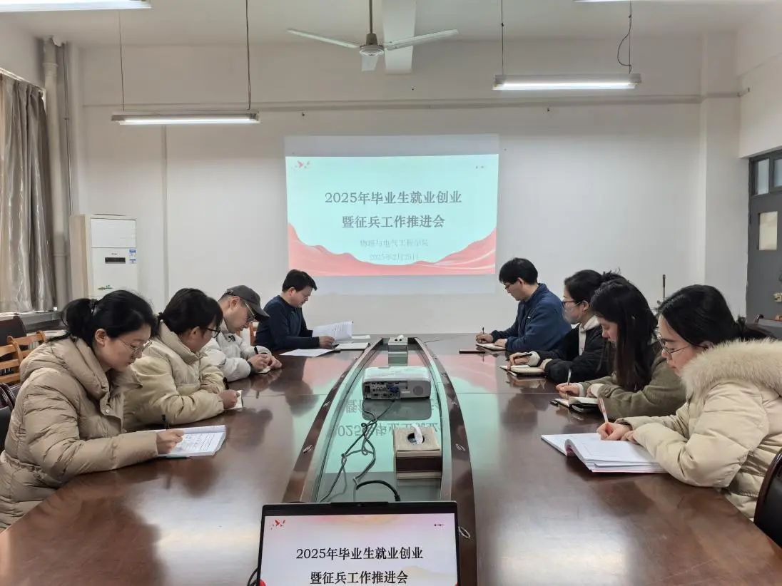 2月25日下午,9728太阳集团在2418会议室召开2025年毕业生就业创业暨征兵工作推进会。学院党总支书记袁卫、院长张修兴、党总支副书记权轻舟、全体辅导员参会。