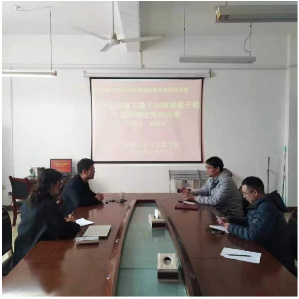 胡教授先为所有教师做了题为《弱测量下量子纠缠和量子相干非局域优势的共享》的报告。首先简要介绍单边和双边弱测量的塌缩态和测量结果概率,然后针对两体高维量子态介绍我们在基于资源理论的量子相干非局域优势刻画,以及基于弱测量和熵不确定关系的两体高维量子纠缠共享、量子相干非局域优势共享等方面所做的几个工作。随后,胡教授胡教授结合自身申报国家自然科学基金面上项目的成功经验,对薛姣姣老师的申报书进行了认真细致的修改。